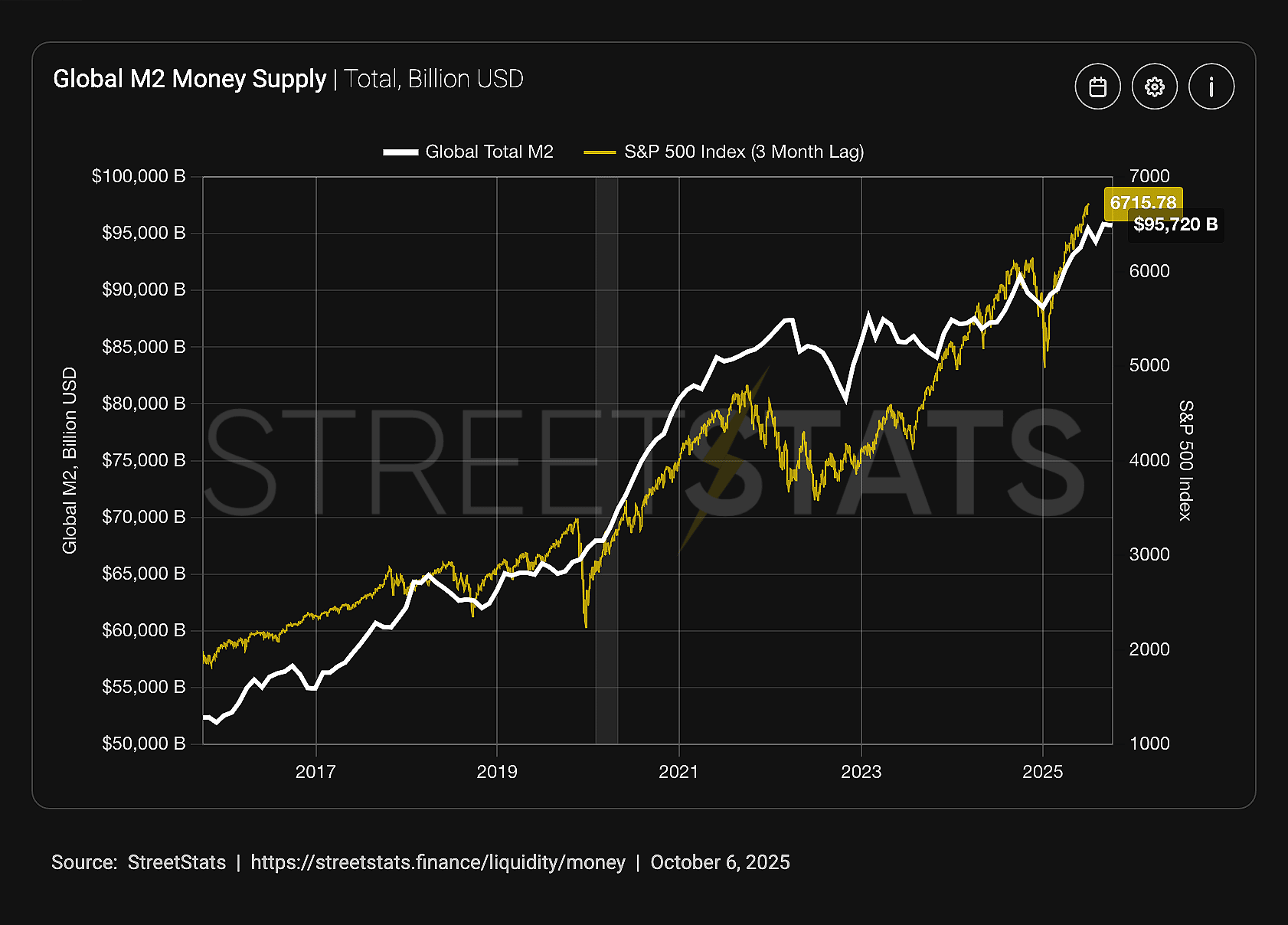 This is basically a measure of how much money is present in global capital markets. As you can see, the higher the money supply, the higher the S&P 500 goes (with a 3 month lag).